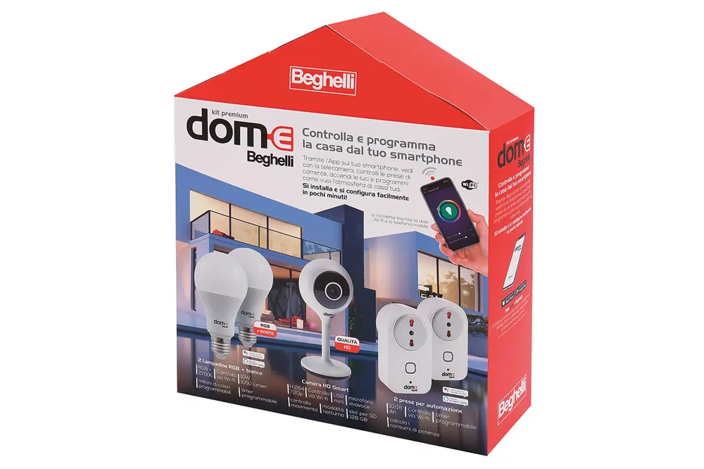 Dom-E Beghelli è un sistema composto da dispositivi con tecnologia smart che sono in grado di connettersi autonomamente alla rete Wi-Fi di casa.