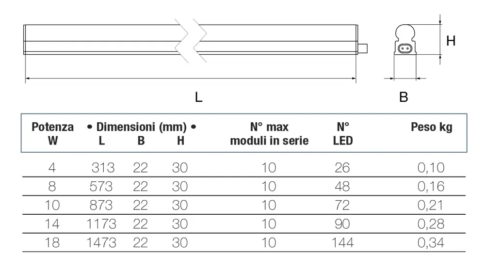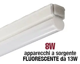 Apparecchio concepito per l’illuminazione sottopensile e indiretta, sia per uso professionale (centro commerciali, vetrine) che domestico. L’utilizzo di LED ad alto rendimento determina bassissimi consumi. Disponibile in cinque misure, è dotato di cablaggio passante per il montaggio in serie.