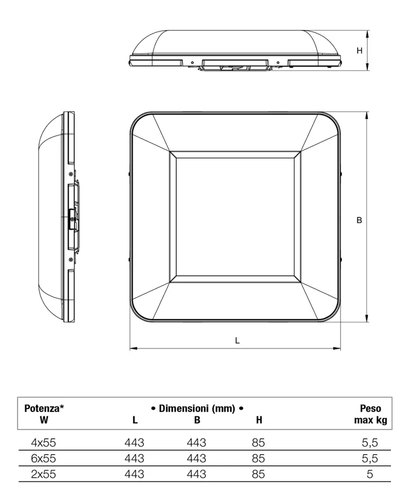 - Ampio angolo di emissione simmetrica sui 4 lati, specifico per luoghi con soffitti particolarmente bassi (versione Parking).