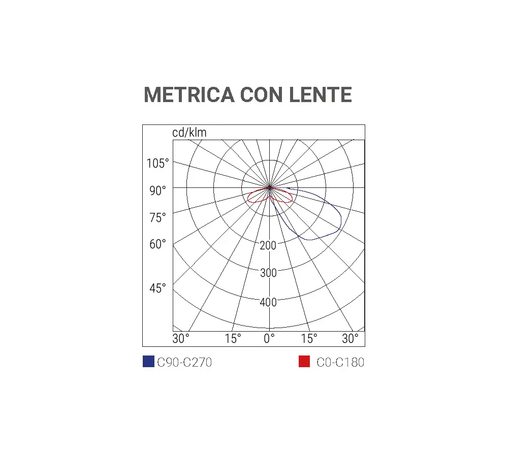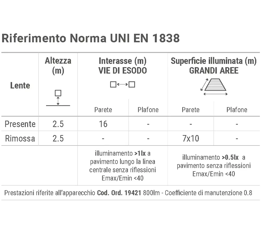 Ottica progettata per orientare il fascio luminoso verso il suolo. Di serie monta una lente addizionale a fascio controllato progettato per le vie di esodo. Smontando la lente l’ampiezza del fascio è ideale per installazioni sopraporta.