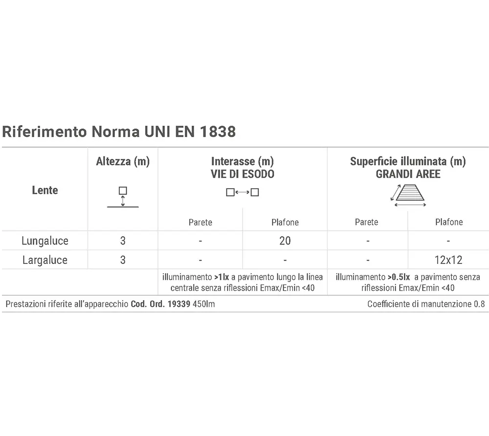 Apparecchio per illuminazione di emergenza ad elevate prestazioni con kit di lenti speciali in PMMA ad elevata trasparenza, sia per versione Lungaluce che Largaluce, in dotazione, per ottenere differenti dimensioni della superficie illuminata. Ogni lente prevede in dotazione una mascherina estetica in policarbonato bianco con sistema di bloccaggio per varie tipologie di controsoffitto. Led ad alta efficienza, corpo con dissipatore integrato in Poliammide caricato a grafite.