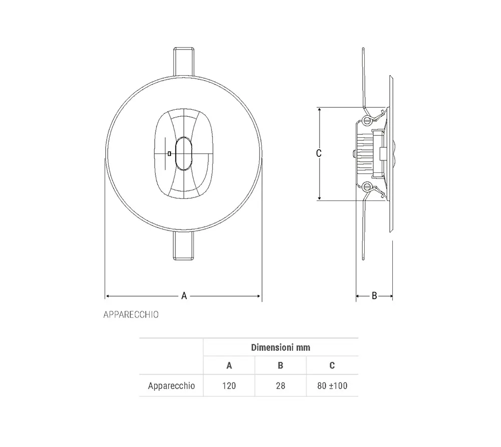 Installazione rapidissima grazie alle molle in acciaio che ne consentono l’orientamento anche ad installazione avvenuta. Foro incasso ø 80÷100mm.