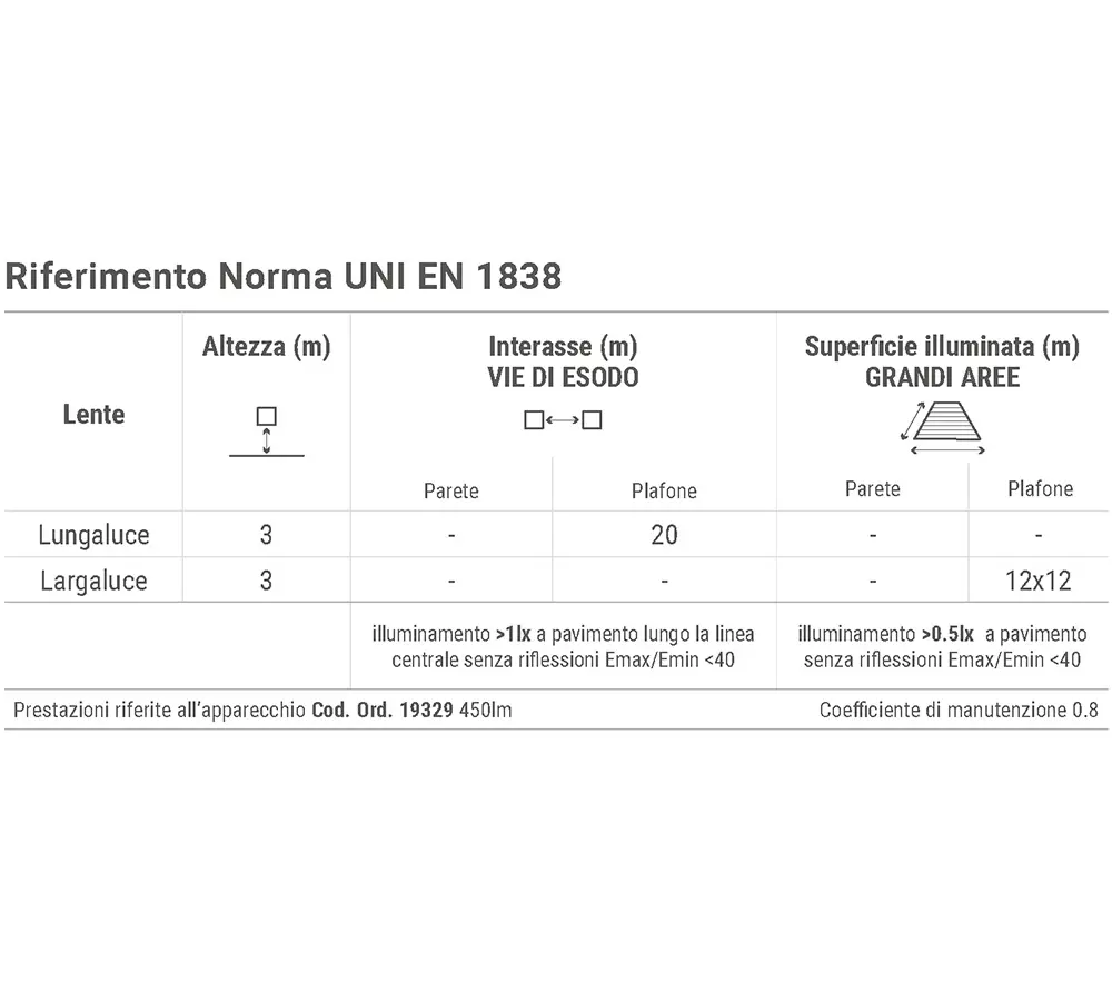 Apparecchio per illuminazione di emergenza ad elevate prestazioni con kit di lenti speciali in PMMA ad elevata trasparenza, sia per versione Lungaluce che Largaluce, in dotazione, per ottenere differenti dimensioni della superficie illuminata. Ogni lente prevede in dotazione una mascherina estetica in policarbonato bianco con sistema di bloccaggio per varie tipologie di controsoffitto. Led ad alta efficienza, corpo con dissipatore integrato in Poliammide caricato a grafite.