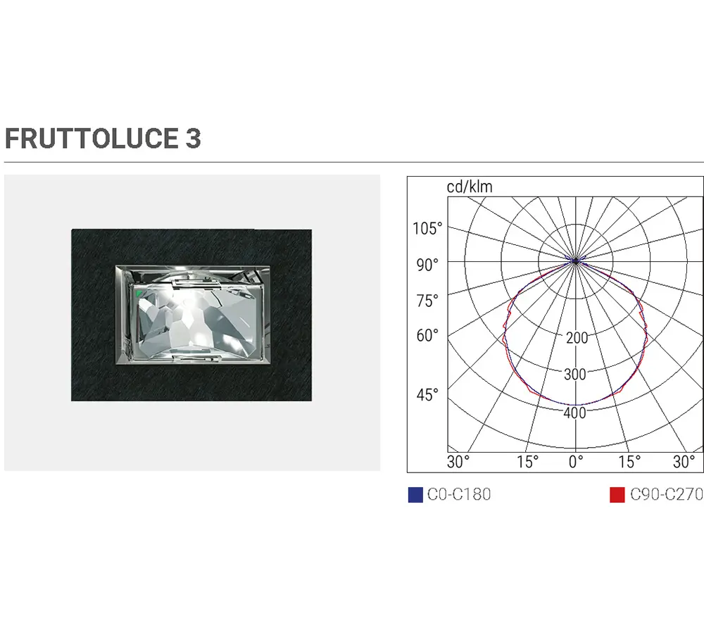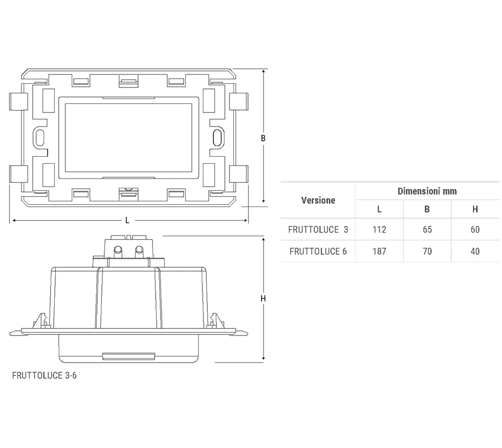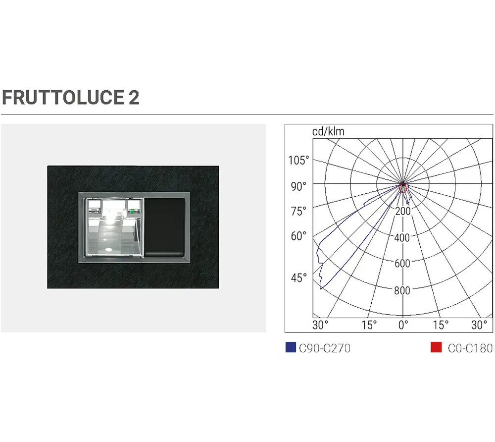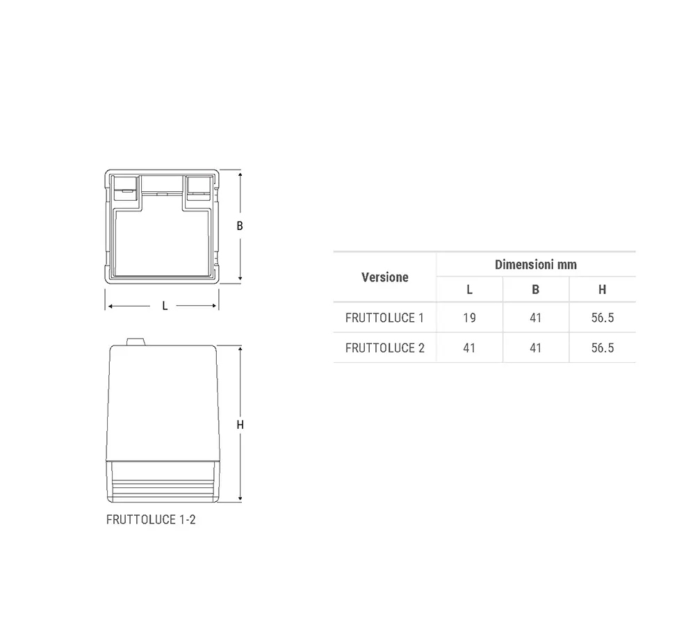 Fruttoluce è stata progettata con una completa dotazione di serie che consente l’installazione all'interno delle serie civili più diffuse mantenendo caratteristiche illuminotecniche elevate in uno spazio ridottissimo occupando un solo modulo di scatola 503.