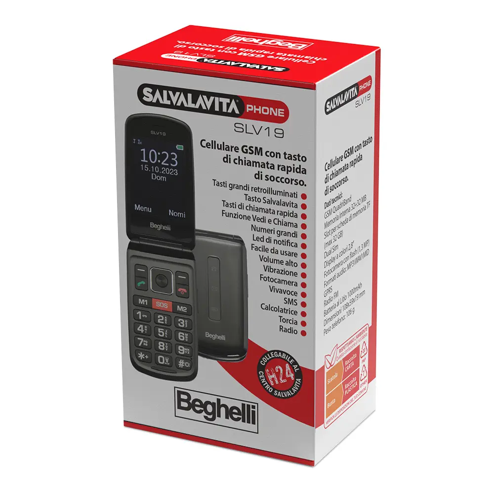 Salvalavita Phone SLV19 è un telefono semplice da usare, con grandi tasti numerici retroilluminati e un display chiaro e ben visibile. Nella tastiera è presente un tasto Salvalavita che se premuto per 2 secondi, lancia chiamate in vivavoce e SMS a 10 numeri di emergenza precedentemente impostati. È possibile attivare un abbonamento ai servizi del Centro Salvalavita H.24. Inserendo una scheda di memoria TF (max 32GB, non inclusa) è possibile utilizzare la fotocamera.