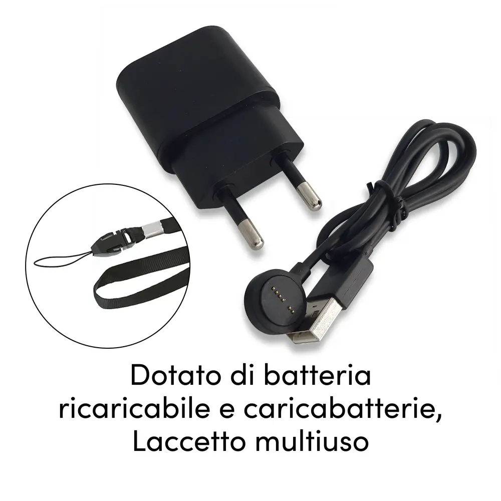 La confezione include un caricabatterie con attacco magnetico e un laccetto multiuso.