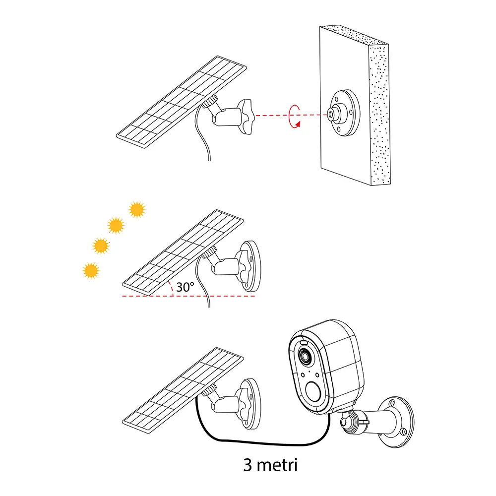 Il supporto da parete orientabile, sia in orizzontale che in verticale, permette la migliore esposizione al sole e le dimensioni compatte di 169x159 mm, il peso di soli 229 grammi e il cavo di 3 metri permettono un’ installazione facile e veloce.