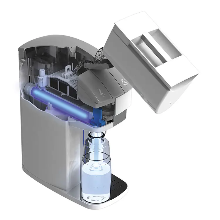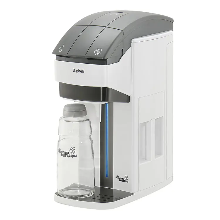 Acquistando il cilindro CO2 e la bottiglia in PET (accessori opzionali) è possibile gasare a piacimento l’acqua con l’apposito pulsante: più a lungo lo tieni premuto, più frizzante sarà l'acqua.