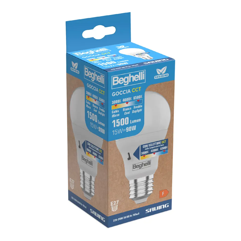 La lampadina Goccia Saving CCT รจ dotata, sul lato del corpo, di selettore che consente di modificare la temperatura della luce tra calda, bianca o fredda.