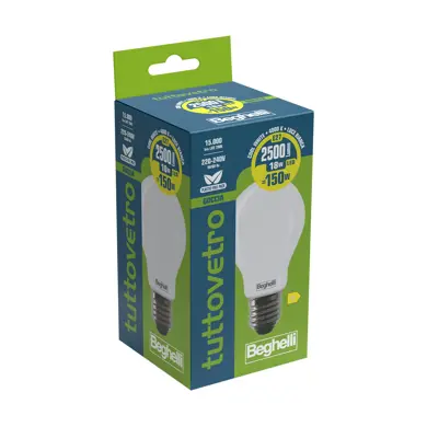Lampadina dalla forma classica con il bulbo completamente in vetro opalino.