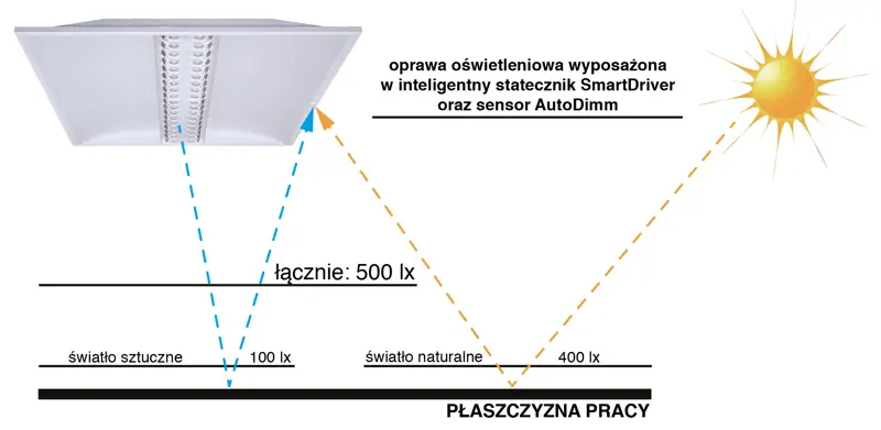 System AutoDimm to nowoczesne rozwiązanie, które umożliwia płynną regulację strumienia świetlnego opraw w taki sposób, aby utrzymać wymagany poziom natężenia oświetlenia na płaszczyźnie pracy. Działa on niezależnie od dobowych zmian ilości światła naturalnego, które przedostaje się do pomieszczenia przez okna lub świetliki.