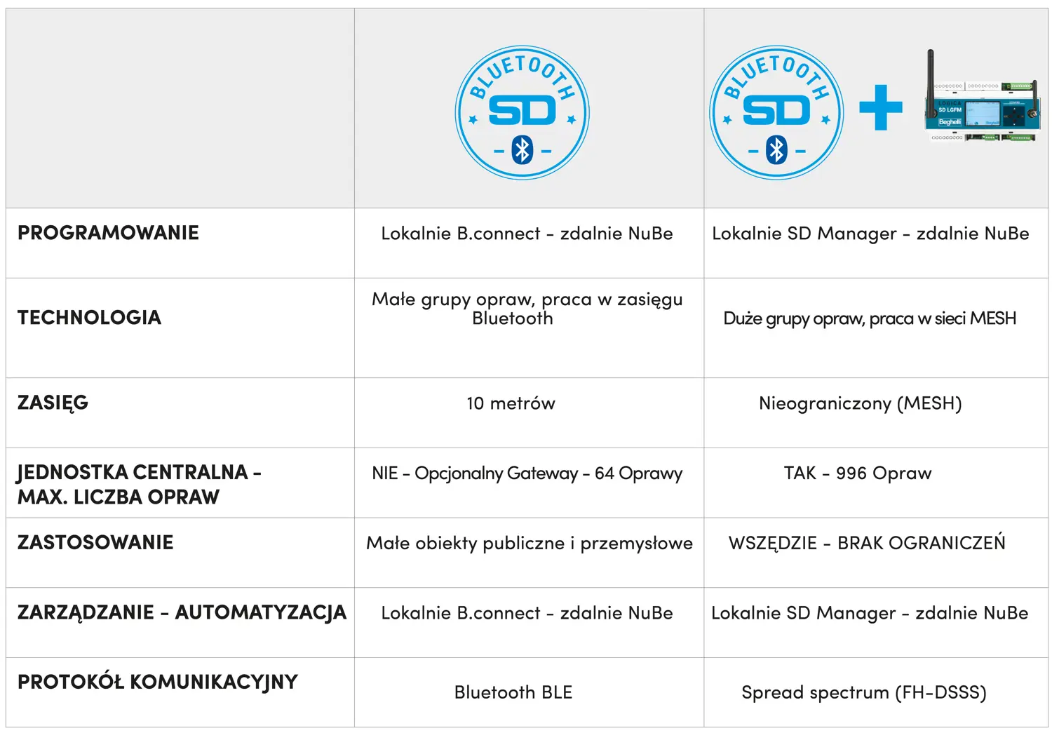 Wszystkie oprawy oświetleniowe z serii Beghelli Smart Driver Bloototh, wykorzystują zaadaptowany standard bezprzewodowej komunikacji krótkiego zasięgu Bluetooth LE. Programowanie opraw SDB odbywa się poprzez graficzny interfejs użytkownika poprzez aplikację B.connect. Zaprojektowana do tworzenia małych systemów automatyki (maksymalnie 64 oprawy na strefę; 250 stref do wyboru), technologia SD Bluetooth umożliwia rozwiązania automatyzacyjne do zarządzania oświetleniem, osiągając bardzo wysoki poziom efektywności energetycznej, z oszczędnościami dochodzącymi do ponad 80%. Zintegrowany interfejs Bluetooth ma zasięg do 12 m, dlatego w dużych projektach zaleca się rozwiązania hybrydowe polegające na rozbudowaniu opraw SDB o moduł komunikacji radiowej FM. W ten sposób otrzymamy bardziej wydajne rozwiązania dla obiektów wielkopowierzchniowych (Tabela 1).