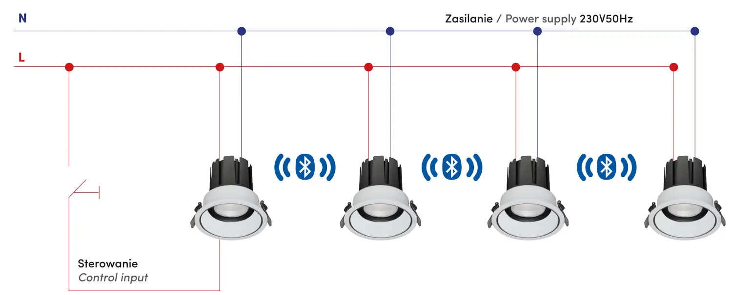 Oprawy oświetleniowe SD Bluetooth są wyposażone w wejście sterujące, które można skonfigurować w różnych trybach. W poniższym przykładzie (schemat 1) wejście służy do regulacji jasności opraw znajdujących się w jednym obszarze, bez konieczności zastosowania dodatkowego okablowania. Napięcie zasilające jest stale obecne na zaciskach wejściowych opraw, a przełącznik jest podłączony do wejścia sterującego tylko jednej z opraw. Ta oprawa, przez Bluetooth, wysyła polecenie do pozostałych odpowiednio skonfigurowanych opraw. To tylko jedno z wielu możliwych zastosowań systemu SDB.