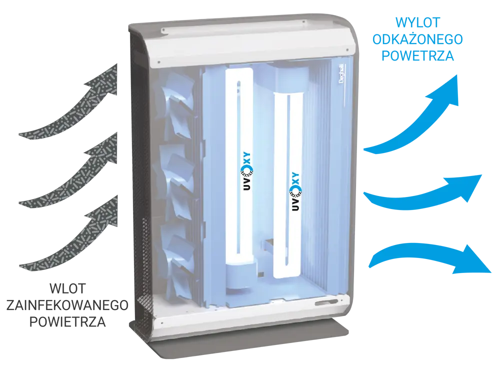 System bocznych wentylatorów osiowych zasysa zainfekowane powietrze do wnętrza urządzenia. Mikroorganizmy, takie, jak: wirusy, bakterie, grzyby, pleśnie czy również inne alergeny zawarte w tzw. ‘nuclei’ w aerozolach w momencie wejścia do komory są od razu neutralizowane przez certyfikowany system promieni ultrafioletowych. Promieniowanie ultrafioletowe bezpośrednio działa na kwasy nukleinowe mikroorganizmów (RNA lub DNA) doprowadzając do dezaktywacji patogenu, który przestaje stanowić zagrożenie dla człowieka.